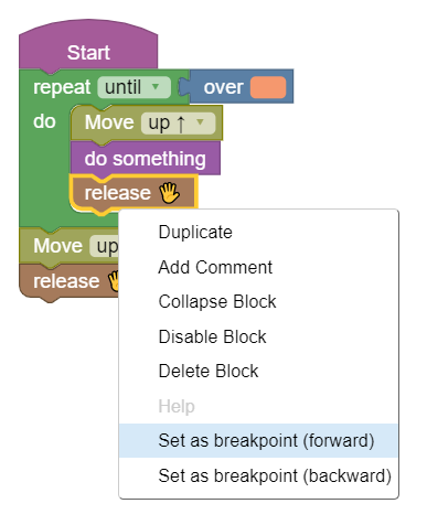 只要您装载了代码,您就可运行它, 使用下面的按键运行 / 暂停 游戏. 您可以使用时间行程调试一次运行一个 代码块 (下一个或上一个).